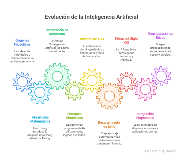 En conclusión, la evolución de la inteligencia artificial es el resultado de un largo proceso en el que convergen reflexiones filosóficas, avances matemáticos, desarrollos tecnológicos y transformaciones sociales. Desde las primeras especulaciones sobre la posibilidad de mecanizar el pensamiento hasta su integración actual en entornos empresariales, la IA ha demostrado ser una disciplina dinámica, en constante redefinición y expansión. Hoy, más que nunca, se erige como un motor de cambio en la era digital, capaz de redefinir la manera en que las organizaciones operan, compiten y generan valor en un mundo globalizado e interconectado.