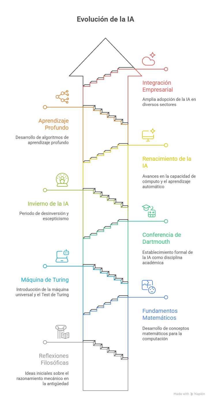 La inteligencia artificial, entendida como el conjunto de técnicas y sistemas que buscan reproducir o emular procesos cognitivos humanos en las máquinas, ha atravesado un recorrido complejo y fascinante desde sus inicios hasta convertirse en uno de los pilares de la transformación digital de la sociedad contemporánea. Su evolución no ha sido lineal ni exenta de obstáculos, sino más bien una sucesión de etapas caracterizadas por momentos de entusiasmo, innovación y crecimiento, intercalados con periodos de estancamiento y cuestionamientos. Analizar esta evolución permite comprender no solo el progreso científico y tecnológico que ha impulsado a la disciplina, sino también las condiciones sociales, culturales y económicas que han permitido su integración en los entornos empresariales actuales.
