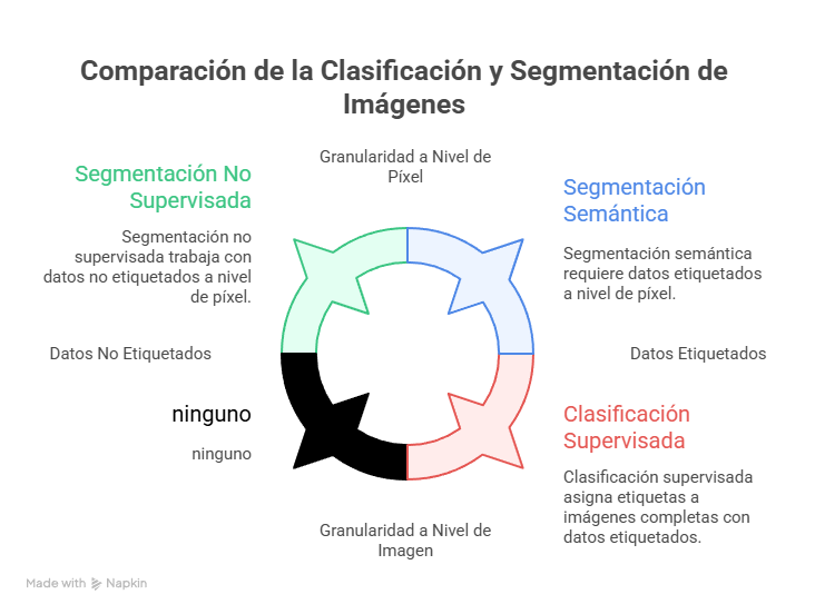 La clasificación y la segmentación son dos tareas fundamentales en el campo del análisis de imágenes y la visión por computadora, pero abordan problemas diferentes y utilizan metodologías distintas, especialmente en el contexto del aprendizaje supervisado y no supervisado. La principal diferencia radica en el nivel de granularidad del resultado y en el tipo de información de entrada que requieren los algoritmos. La clasificación de imágenes asigna una etiqueta única a una imagen completa, mientras que la segmentación categoriza cada píxel individualmente. La clasificación supervisada necesita datos previamente etiquetados, mientras que la segmentación no supervisada trabaja con datos sin etiquetas, buscando patrones inherentes.
