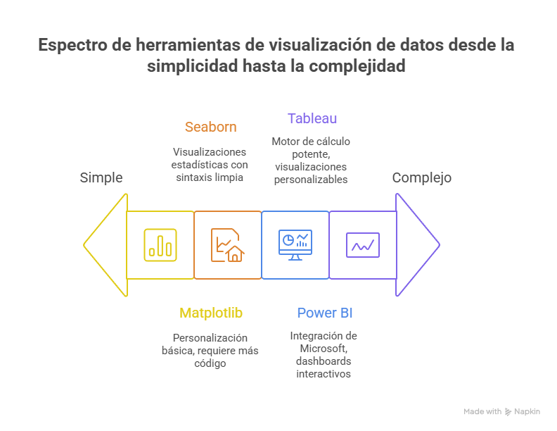 Seaborn es otra biblioteca de visualización de Python, construida sobre Matplotlib. A diferencia de Matplotlib, que se centra en la estructura de los gráficos, Seaborn se enfoca en la creación de visualizaciones estadísticas atractivas y altamente funcionales con un código mínimo. Es ideal para explorar relaciones entre variables, visualizar distribuciones y crear gráficos complejos como los mapas de calor y los diagramas de violín con facilidad. Seaborn es la opción preferida de muchos científicos de datos para el análisis exploratorio de datos (EDA), ya que produce gráficos de alta calidad con una sintaxis limpia y sencilla. La elección entre estas herramientas depende en última instancia de la audiencia, la complejidad del proyecto y el nivel de experiencia técnica del usuario.